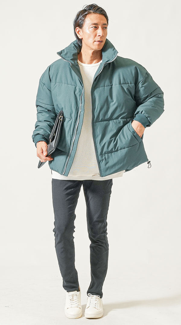ボリューム感のあるアウターは、高身長の男性でも着こなし方を間違えると野暮ったく見えてしまいます。このブルゾンは、落ち感のあるフォルムと長すぎない着丈により、体格を活かしながらスマートな印象に。インナーの白ニットは裾をあえて見せて縦のラインを分断し、脚長すぎる印象を緩和。全体はモノトーンで統一しつつも、白スニーカーで抜け感を加えた軽やかな冬のカジュアルスタイルです。