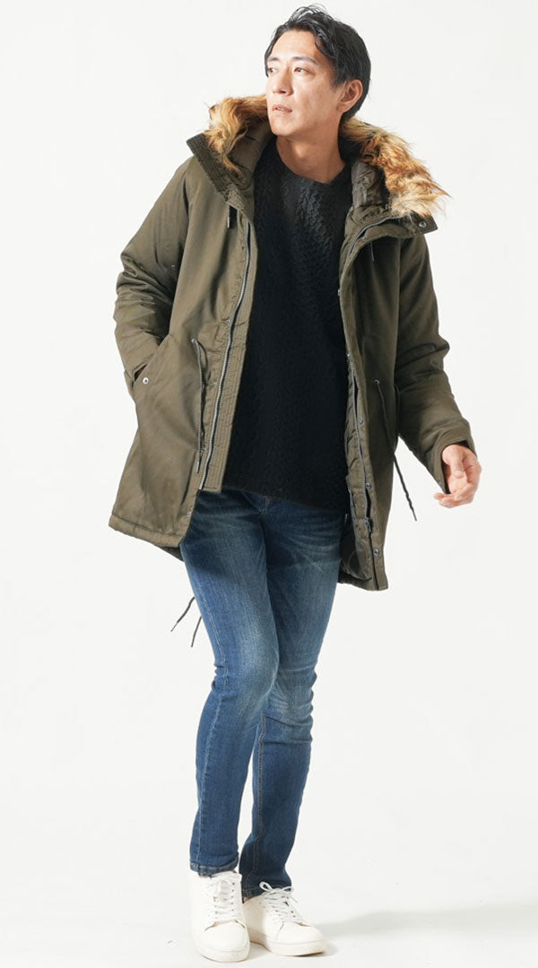 防寒性の高いミリタリー系モッズコートに、ケーブルニットとデニムを合わせた冬の定番コーデ。高身長の体型にありがちな「着ぶくれ」を避けるため、パンツはタイトに、アウターは腰下まで隠れる丈感で調整しています。ファー付きのフードが顔まわりにボリュームを与え、視線のバランスも自然に。白スニーカーでカジュアルさを加えつつ、全体を引き締めたスタイルです。