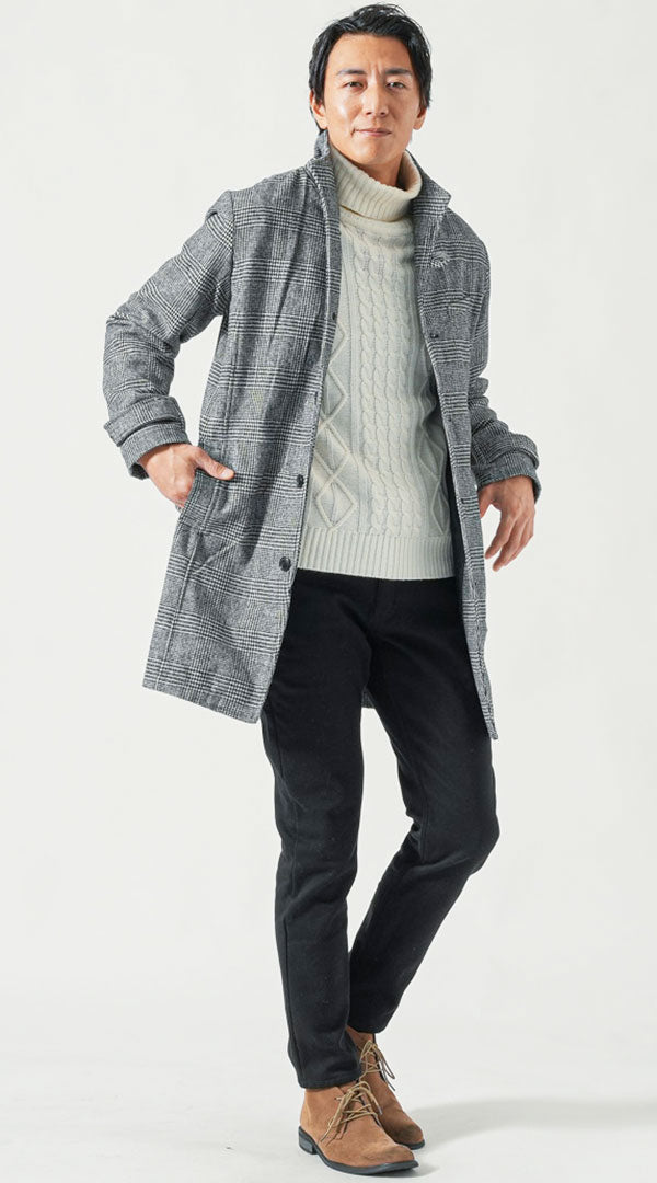 ボリュームのあるタートルニットとミドル丈のチェック柄コートを重ねたスタイル。高身長の方は、コートが短すぎるとアンバランスに見えやすいですが、このコートは太もも中ほどの長さで、脚の長さと上半身のボリュームをうまく整えてくれます。黒パンツで全体を引き締めつつ、足元のブーツで季節感も加味。冬らしい素材感とシルエットを活かした、大人の落ち着きを感じさせる着こなしです。