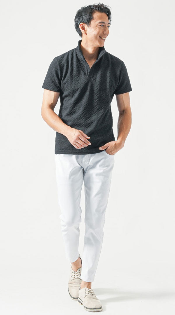 夏は軽装になりすぎると子どもっぽく見えがちですが、モノトーンなら清潔感と落ち着きを両立できます。黒のポロシャツは高身長の肩幅と相性が良く、立ち襟デザインでさりげなく存在感をプラス。白パンツはテーパードで足元がすっきりしており、脚の長さを活かしつつ全体を引き締めます。シンプルながら計算された配色とシルエットが、スマートな夏スタイルを作ります。
