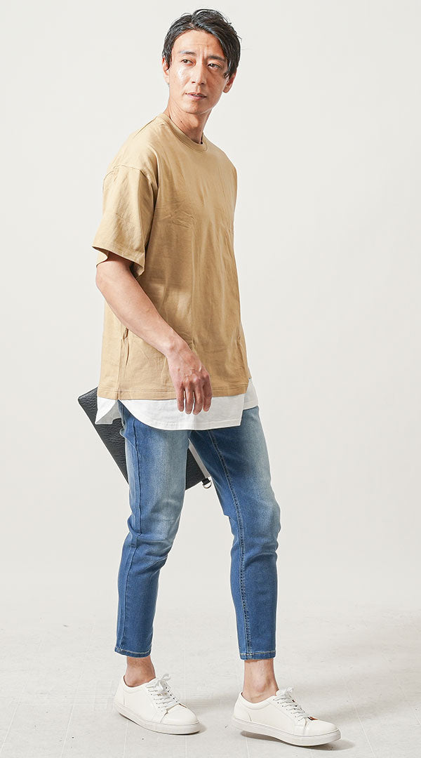 シンプルなTシャツ1枚だと着丈が短く見え、スタイルに違和感が出やすいのが高身長の悩み。ベージュTシャツに白インナーをレイヤードすることで、腰位置を自然にカバーしながら抜け感を演出しています。細身のデニムで脚のラインをすっきり見せ、白スニーカーで軽快にまとめたバランスの良い夏の装い。カジュアルながらも清潔感があり、大人の余裕を感じさせるコーディネートです。