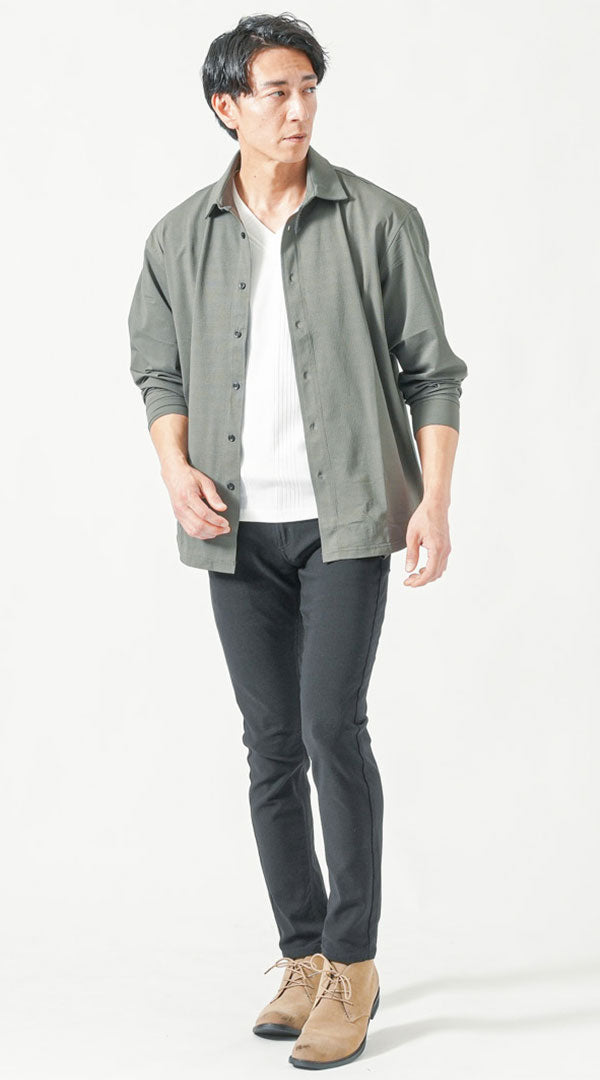 くすみグリーンのオープンカラーシャツと白リブカットソー、黒スキニーパンツを組み合わせた秋のリラックススタイル。シャツは高身長の方にも対応する長めの着丈で、腰位置を自然にカバーしながら落ち感のあるシルエットに。パンツはタイトでもバランスよく、足元のベージュブーツが季節感を加えています。頑張りすぎないのに洗練された印象を与える、大人のための秋コーデです。