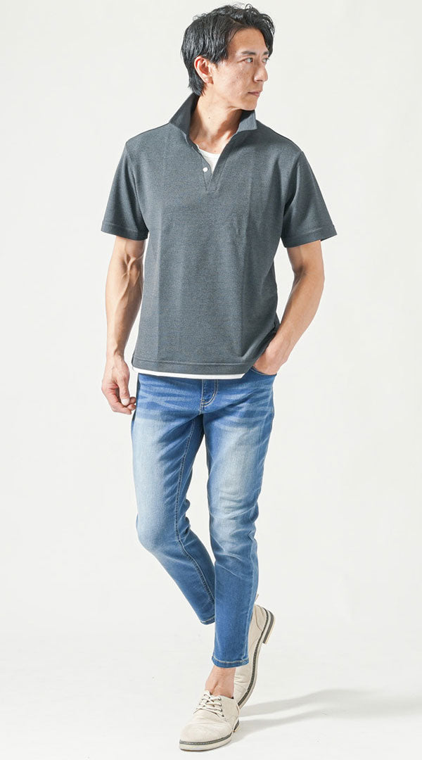 夏の軽装は着丈の短さが目立ちやすく、高身長の男性にとってはスタイルを崩す原因になりがちです。このコーデは、襟付きのポロ風カットソーに白Tシャツをレイヤードすることで、腰位置をカバーしながら縦長印象をやわらげています。爽やかなデニムで清潔感もあり、足元の明るいシューズが全体に抜け感を与えるバランスの取れた夏の装いです。