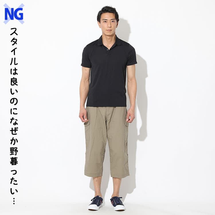 たとえば、夏場に黒のポロシャツと七分丈のカーゴパンツを合わせたつもりが、脚の長さが目立ちすぎて不自然に見えたり、ポロシャツが体にぴったりしすぎて圧迫感が出てしまう。実際にそうした組み合わせをして「なぜか妙にバランスが悪い」と悩んだ経験がある方も多いのではないでしょうか。