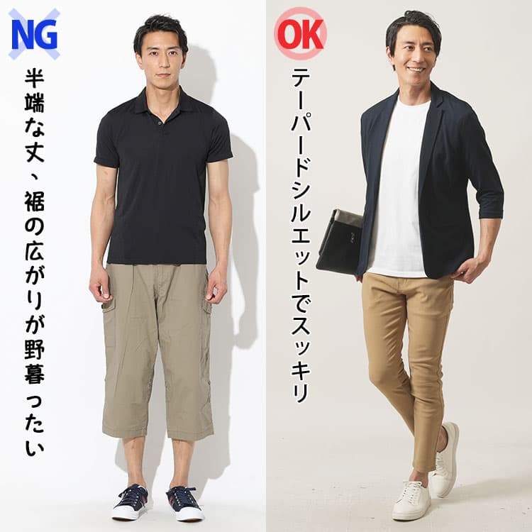 爽やかな印象を求めてクロップドパンツを選んだのに、足元ばかりが目立ってしまい、逆にアンバランスに見えることがあります。脚が強調されすぎて浮いて見えると、全体の調和が崩れてしまいます。