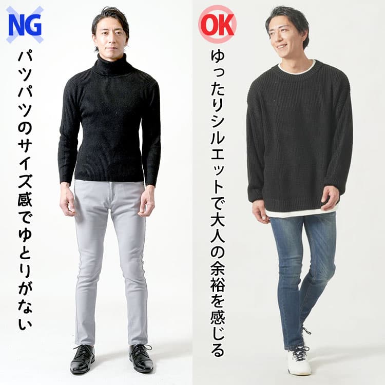 無地のタートルネックやTシャツなど、誰でも着やすい服を選んでいるはずなのに、なぜか野暮ったく見えてしまう。それは服が体にぴったりしすぎていて、着ているというよりも“張りついている”ように見えることが原因かもしれません。