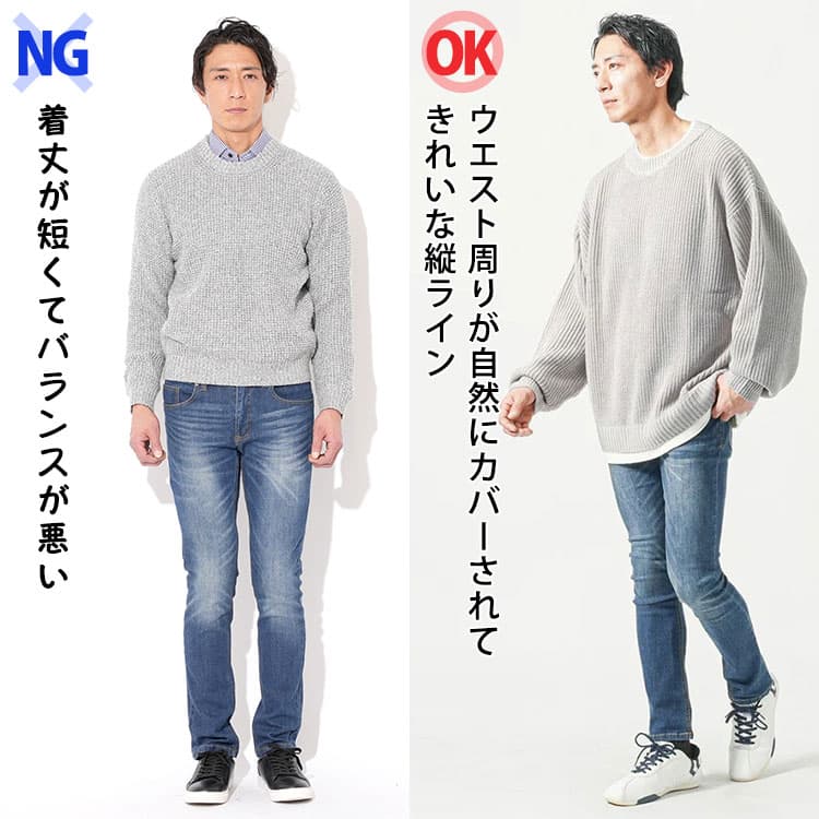 日本国内で流通しているトップスの多くは、平均的な身長に合わせて設計されています。そのため、180cmを超えるような高身長の方が標準サイズを着ると、着丈が短くなり、ウエストが露出したり、インナーが中途半端に見えたりすることがよくあります。着丈の足りなさは「小さめの服を着ている人」のような印象を与え、垢抜けない原因になります。