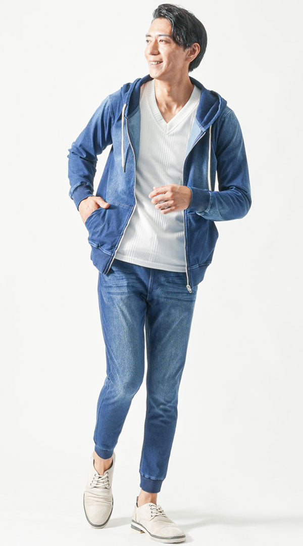 デニムライクなパーカーとパンツのセットアップは、カジュアルで親しみやすさを持ちつつも全体がまとまりやすい万能アイテム。白Tを挟むことで抜け感も演出され、40代でも爽やかに決まります。