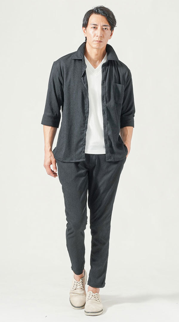 風合いのある素材で魅せる、立体感あるブラックセットアップ