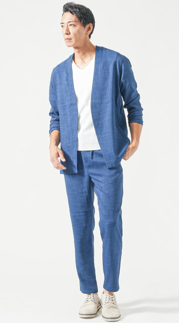 カーディガン風のノーカラージャケットが特徴のネイビーセットアップ。通常のジャケットよりもラフで涼しく、Tシャツと合わせてもサマになります。パンツはスリムシルエットで上品さを維持。ちょっとした外出や、冷房対策を意識した室内シーンにも重宝します。