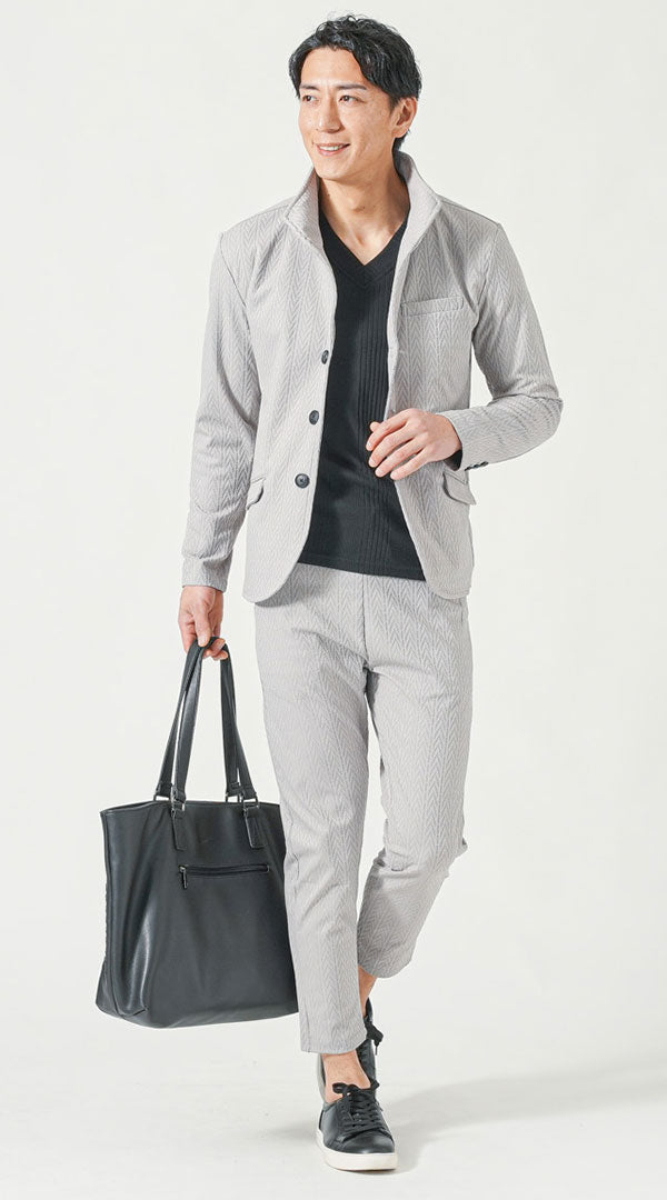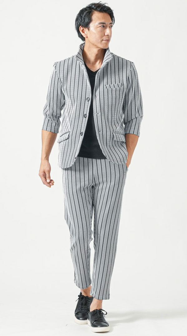 視線を集める立体感、ストライプ調グレーの“洒落感セットアップ”