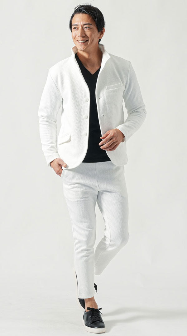 ホワイトをベースにしたパイルジャガード柄セットアップは、清潔感とモードな雰囲気を両立。インナーを黒にすることで印象が引き締まり、軽くなりすぎず大人にちょうどいい抜け感に。