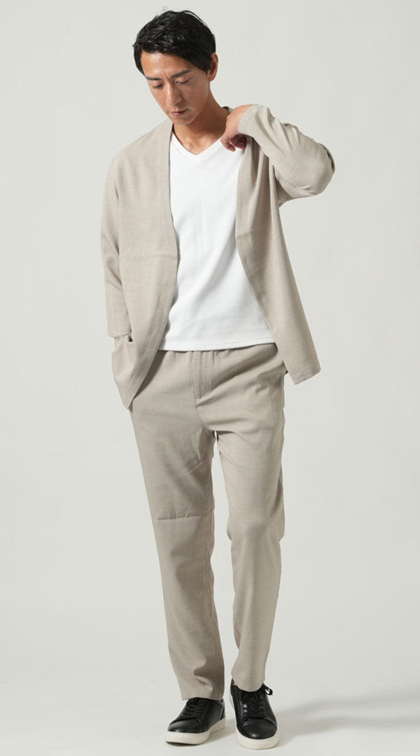 テーラードの堅さが苦手な方におすすめの、カーディガン風セットアップ。淡いベージュと白のVネックがクリーンな印象を与え、黒スニーカーで全体を引き締めたバランスの良いコーデ。デスクワークからリモート対応にも◎。