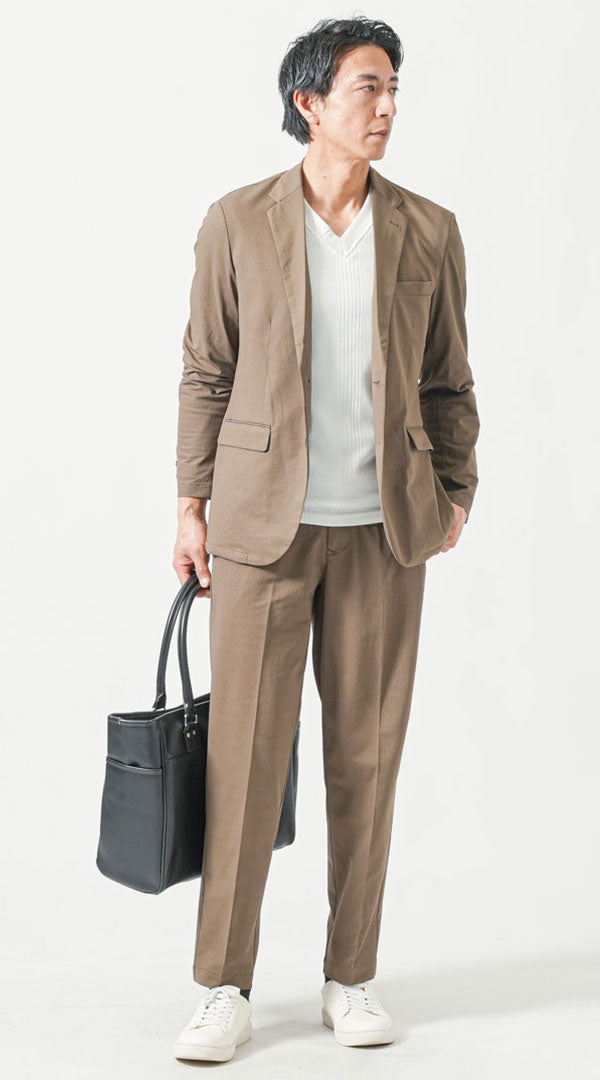 ブラウンのセットアップは、40代男性に特におすすめの落ち着いた色味。白インナーとスニーカーでメリハリをつけることで、抜け感のある都会的な印象に仕上がっています。