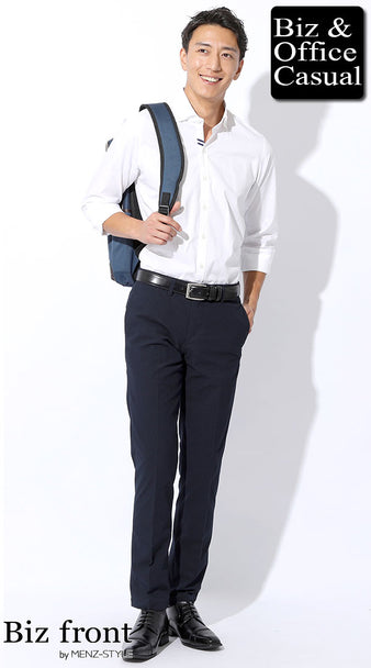 白シャツとネイビーパンツで魅せる、リュックが自然に馴染む通勤スタイル