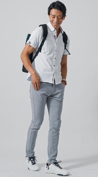 白シャツ×グレーパンツでつくる、リュックが浮かない爽やか大人コーデ