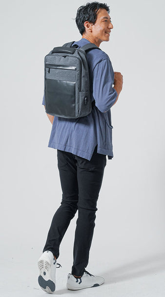 マットな質感の黒やネイビー、金具が少ない角ばった形のリュックなら、白シャツやジャケットとも自然に馴染み、清潔感と落ち着きを演出できます。