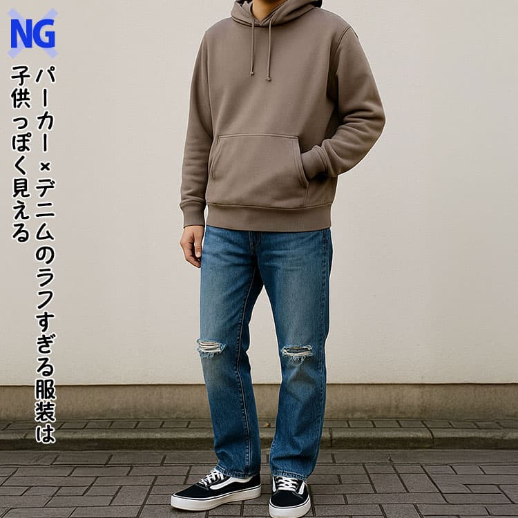 特に、色褪せたデニムやボリュームのあるパーカーを合わせてしまうと、清潔感が薄れ、学生のような服装に見えてしまいます。