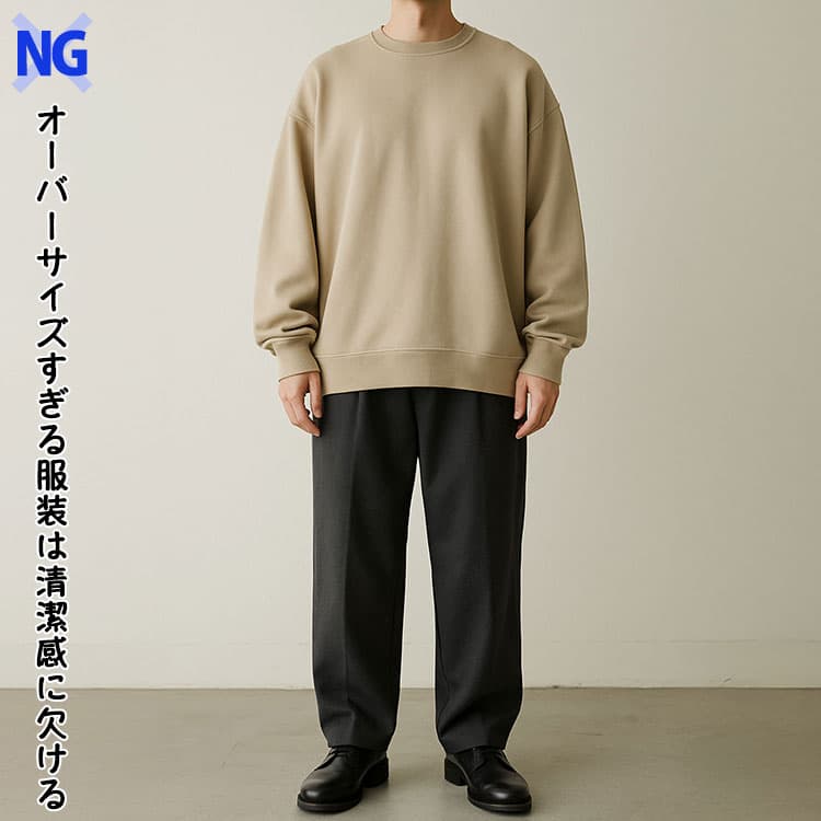 特に、肩が落ちすぎていたり、袖丈が手の甲を隠すほど長かったりすると服に着られているように見えてしまい、清潔感に欠ける印象を与えます。