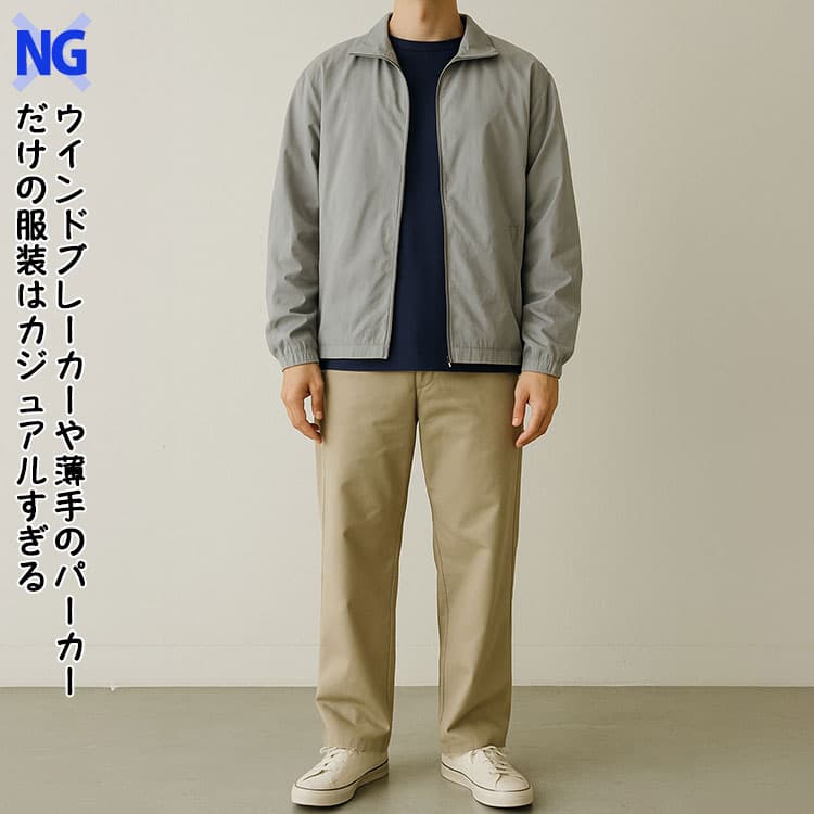 また、ナイロン素材のウインドブレーカーや、薄手のパーカーだけといった服装はカジュアルさが強く、子どもっぽさを感じさせます。