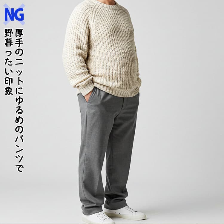 上半身に厚手のニットや重ね着をして、下半身にゆるめのパンツを合わせると、全体が膨張した印象になりやすく、野暮ったさにつながります。