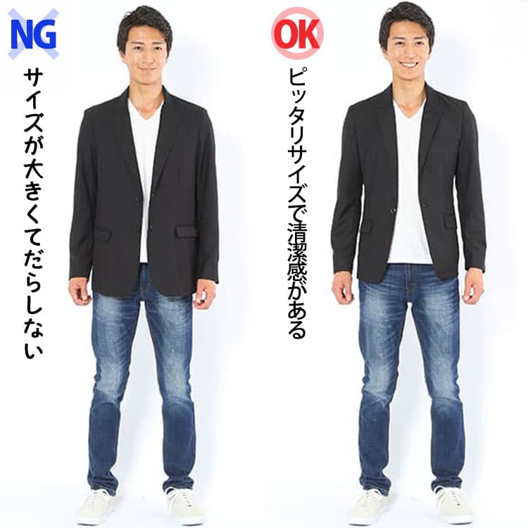 見た目に清潔感やまとまりを出すためには、体に合ったサイズ選びが欠かせません。