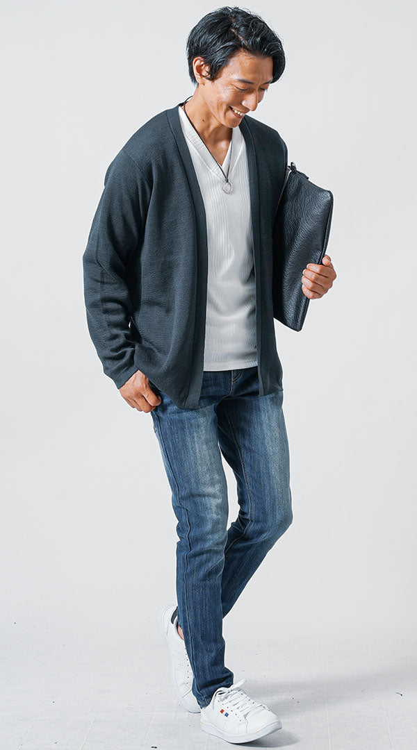 40代メンズ春服全身3点コーデセット 黒カーディガン×白VネックTシャツ×ネイビーデニムパンツ