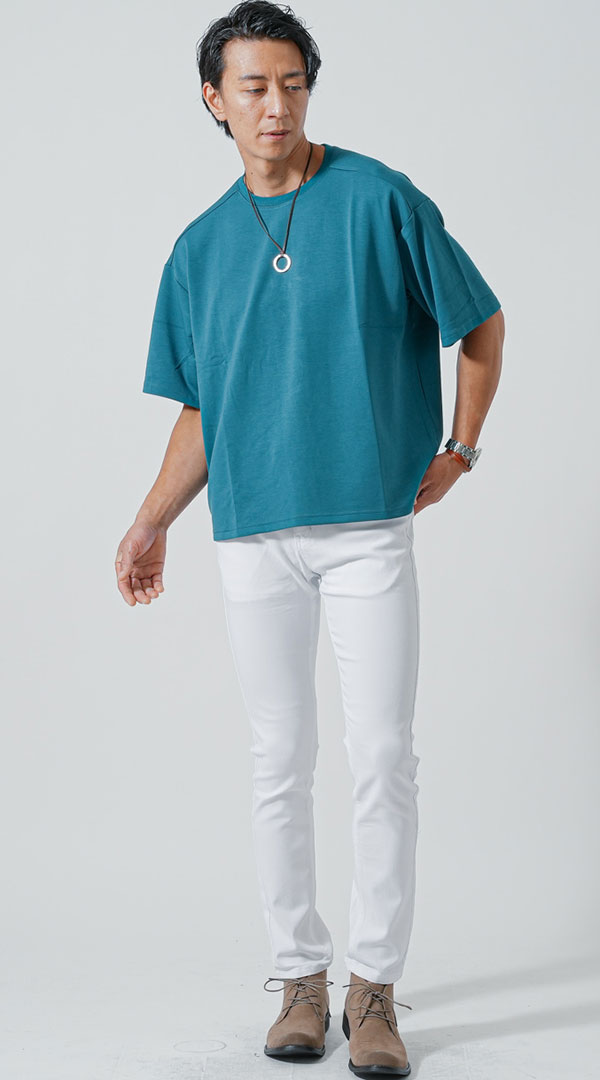 さきほど白Tシャツは汚れるので避けたほうがいいとも提案しましたが、夏アウターを羽織ることで汚れを防ぐことができるなら白tもあり。