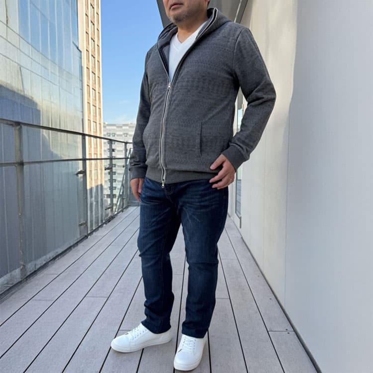 パーカーのリラックス感とデニムのカジュアルさが自然にマッチし、気取らずおしゃれに見える王道スタイルが完成します。