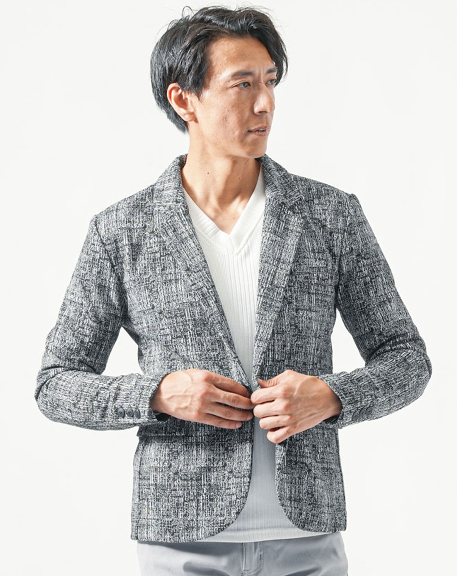 ジャケットの着丈が短めなことで脚の長さが強調され、Vネックインナーが顔まわりに抜け感を与えてくれます。
