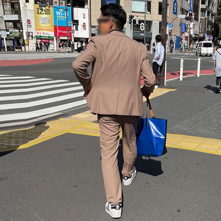 がっちり体型の方には、肩まわりにゆとりがありつつ着丈はやや短めのジャケットを選ぶとバランスが取りやすくなります。