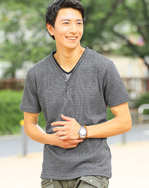 30代40代50代の男性におすすめのメンズヘンリーネックTシャツは、長袖・半袖・七分袖の豊富な袖丈から選べる大人のおしゃれアイテムです。襟元のボタンが程よいアクセントになり、無地Tシャツよりも洗練された印象を与えるため、職場の同僚や奥様からも好印象を持たれます。従来の細身シルエットにこだわらず、肩回りや胸元にほどよいゆとりを持たせた現代的なシルエットなら、体型の変化が気になる年代でも自然に着こなせて落ち感のある大人スタイルが完成します。休日の子供の送迎や近所への外出時にも、一枚でサマになるきれいめカジュアルな印象を演出でき、デニムやチノパンとの相性も抜群です。白・黒・グレー・ネイビーなどの定番カラーを中心に、春夏の涼しい半袖から秋冬の暖かい長袖まで季節に応じた着回しも可能で、何を着ればよいか迷いがちな大人男性の強い味方となります。まずは気になるデザインや色味から、あなたにぴったりの一枚を見つけてください。