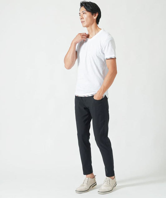メンズスタイルがおすすめする無地メンズVネックTシャツは、30代40代50代の大人の男性にこそ選んでほしい、シンプルで上品な着こなしを叶えるアイテムです。Vネックの適度な開きが首元をすっきりと見せ、無地デザインだからこそ大人らしい落ち着いた印象を演出できます。昔のようなタイトな細身シルエットではなく、程よいゆとりを持たせた現代的なシルエットは、変化した体型にも自然にフィットし、肩回りや二の腕周りを楽に包み込みます。通勤の行き帰りにジャケットのインナーとして、休日のカジュアルスタイルの主役として、どんなシーンでも職場や家族から好印象を得られる着こなしが完成します。半袖から長袖まで豊富な袖丈、きれいめからリラックス感のあるカジュアルまで幅広いテイストをご用意しているので、今の自分にぴったりの一枚がきっと見つかります。