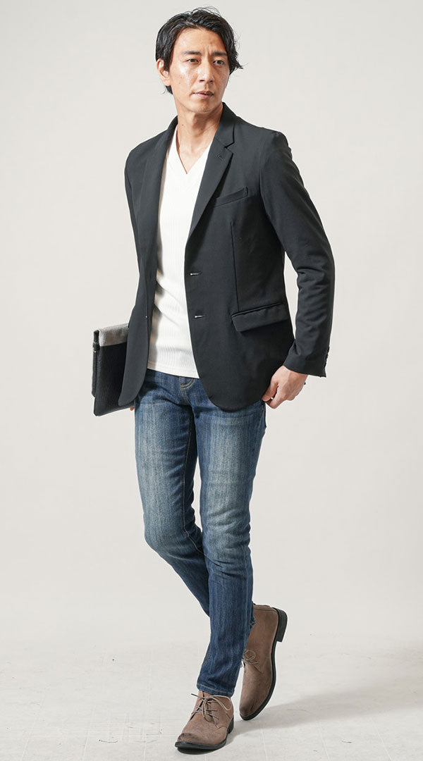 黒テーラードジャケット×ネイビーパンツの組み合わせは、30代40代50代の大人の男性にとって最も失敗しにくく、きちんと感のある定番コーディネートです。ネイビーの深みのある色合いが黒ジャケットを引き立て、職場での会議や取引先との面談でも好印象を与える上品な仕上がりになります。以前は細身のスリムパンツが主流でしたが、現在は程よいゆとりのあるシルエットが大人の余裕を演出し、お腹周りも自然にカバーしてくれるため体型を気にせず着こなせます。ビジネスシーンではもちろん、休日の家族とのお出かけや子供の送迎時にもカジュアルダウンして活用でき、一着で幅広いTPOに対応できる汎用性の高さが魅力です。チノパンやスラックス、デニムなど素材の違いによって印象も変わるため、まずは気になるスタイルから詳細をチェックしてみてください。