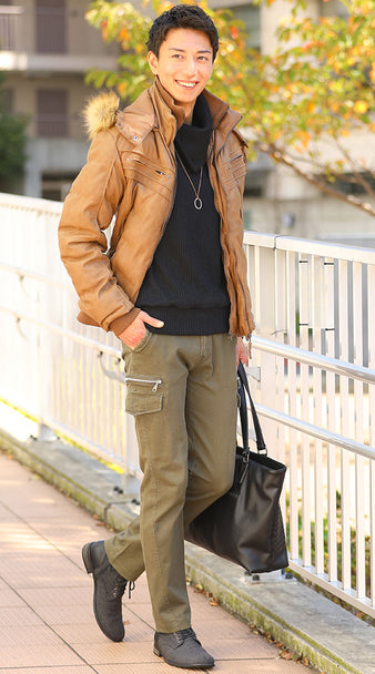 ブラックのタートルネックニットにカーキカーゴパンツを合わせたミリタリーファッションは、小物も黒で統一することで男らしい雰囲気を作ります。