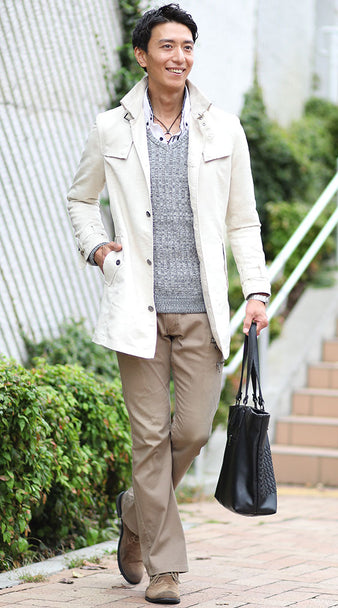 リブニット×スタンドカラーコート×白シャツ×ベージュチノパン