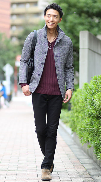 メンズ冬服全身4点コーデセット グレンチェック長袖ジャケット×ワイン長袖ニットTシャツ×黒長袖シャツ×黒チノパンツ