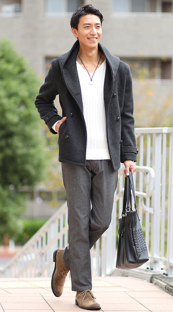 メンズ冬服全身3点コーデセット グレーチェスターロングコート×ワインタートルネックニット×ベージュカーゴパンツ