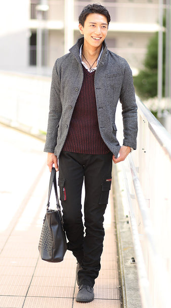 イタリアンカラージャケットに黒のカーゴパンツを合わせた、きれいめカジュアルコーデです。