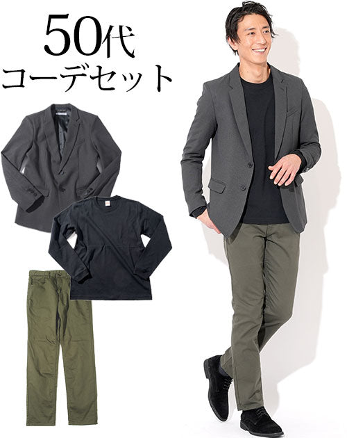 50代メンズ3点コーデセット グレーテーラードジャケット×黒長袖Tシャツ×カーキストレッチチノパンツ biz