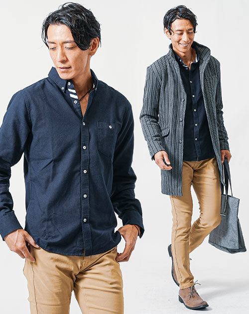 40代メンズ冬の3点コーデセット グレーロングコート×ネイビー長袖シャツ×ベージュスリムチノパンツ