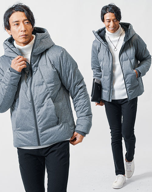 40代メンズ冬の3点コーデセット グレーダウンジャケット×白タートルネックニット×黒スリムチノパンツ