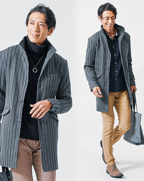 がっちり体型の方におすすめ冬の4点コーデセット グレースタンドカラーロングコート×黒ニットアウター×白長袖Tシャツ×ネイビーデニムパンツ