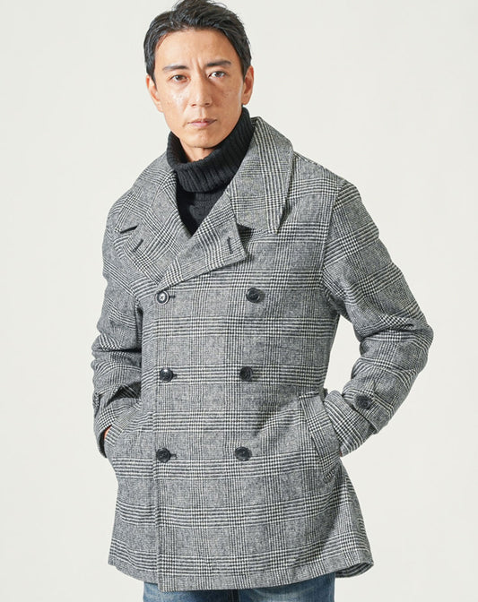 がっちり体型の方におすすめ冬の3点コーデセット グレンチェックメルトンコート×ワインタートルネックニット×黒スリムチノパンツ
