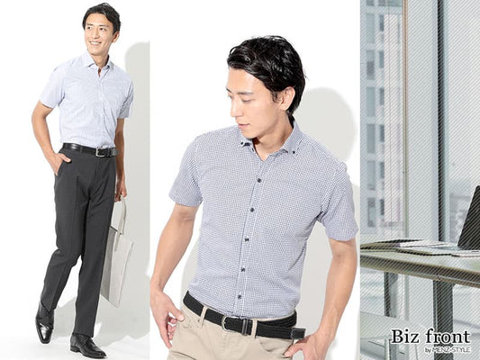形態安定・立体裁断ドビーシャドウチェック前立てデザインボタンダウンビジネスカジュアル長袖スリムシャツ Biz