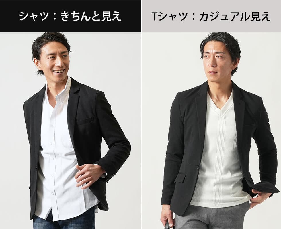 この1点だけで黒ジャケットカッコ良い着こなしが完成します。