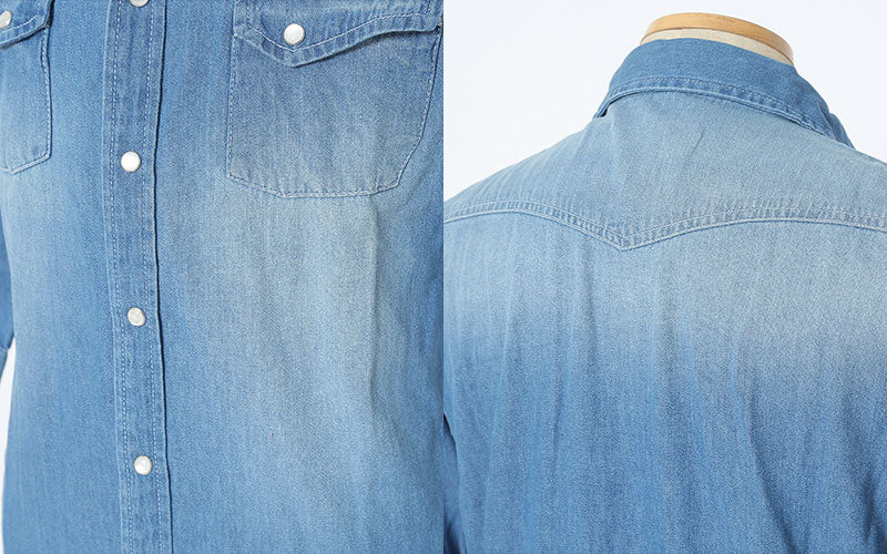 ウエスタンシャツのディテール(肩・背中上部にあるヨーク(切り替え)、胸部分のフラップポケット、スナップボタン)を取り入れたことでラフさが加わり男らしく魅せてくれます!