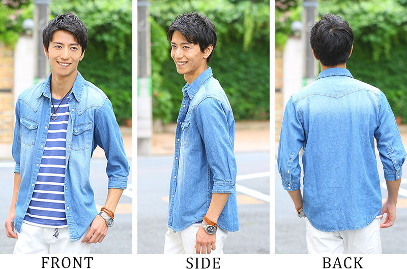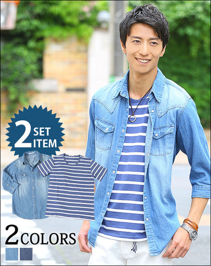 【シャレ感と男らしさを1つにまとめた女の子ウケ3割増しセット♪】ウエスタンデザイン7分袖デニムシャツ×Uネックボーダー半袖カットソー 2点セット
