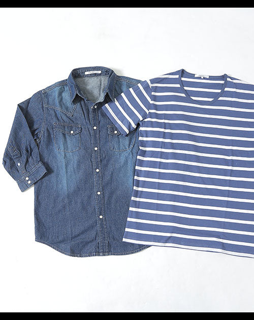 • ウエスタンデザイン7分袖デニムシャツ×Uネックボーダー半袖カットソー 2点セット