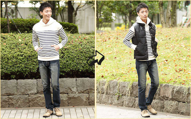 プルパーカーと相性の良いベストを羽織ったワイルドコーデ。